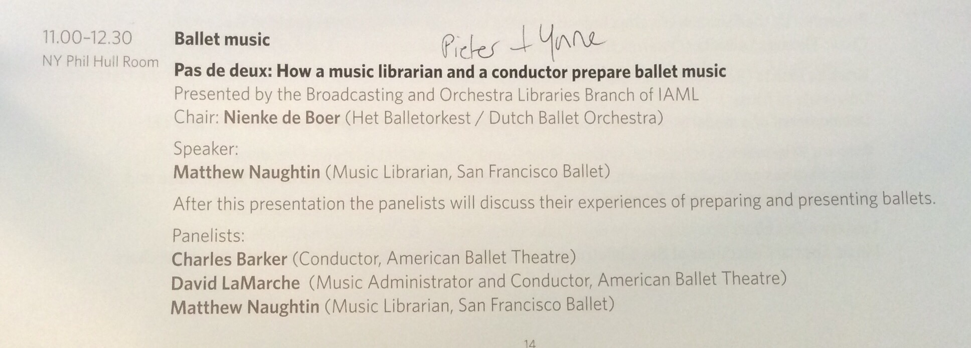 We moesten het gebouw uit en de straat oversteken (het is inmiddels bloedheet, geen regen meer maar zon). We zijn een totaal verlaten gebouw ingelopen en zwierven rond op zoek naar IAML signs. Uiteindelijk eindigden we bij de box-office en daar was een aardige bewaker die ons uitlegde dat we ook dit gebouw uit moesten lopen en dan om de hoek weer naar binnen via de Stage entrance. Trap op, gang door, lift naar de 4e verdieping. En eindelijk zijn we er. Matthew Naughtin van San Francisco Ballet is allang begonnen. Hij heeft een boek geschreven “Ballet music : a handbook”. Hieronder de gegevens van deze sessie.
