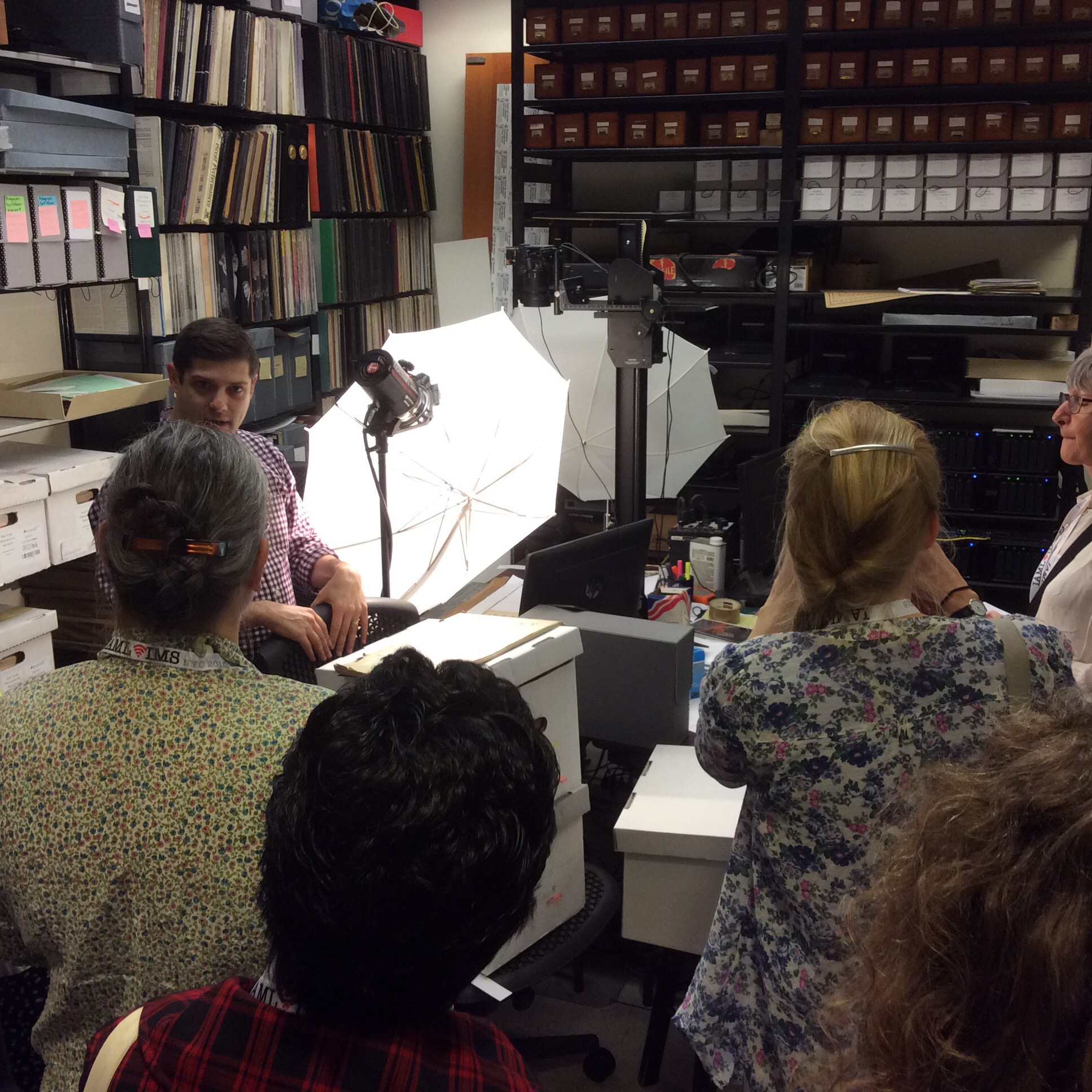Na mijn laatste blog hebben we met een klein groepje mensen nog een rondleiding gehad in het archief van The New York Philharmonic Orchestra. Heel bijzonder om de partituur te zien die is gebruikt voor hun allereerste uitvoering in 1842. (5e van Beethoven). Alles hebben ze bewaard; elke aantekening van elke dirigent! Ze zijn bezig met hun archief te digitaliseren en verder te onderzoeken. Het digitaliseren doen ze gewoon in huis want ze alle muziek moet beschikbaar blijven voor het orkest. Hieronder de opstelling waarme ze dat doen. De camera hangt aan een stellage en de parapluutjes zorgen voor een goede belichting. Een fotograaf heeft de optimale opstelling van de camera bepaald. Daarna legt een archiefmedewerker het klaar en kan het scannen beginnen. 2000 scans per dag!