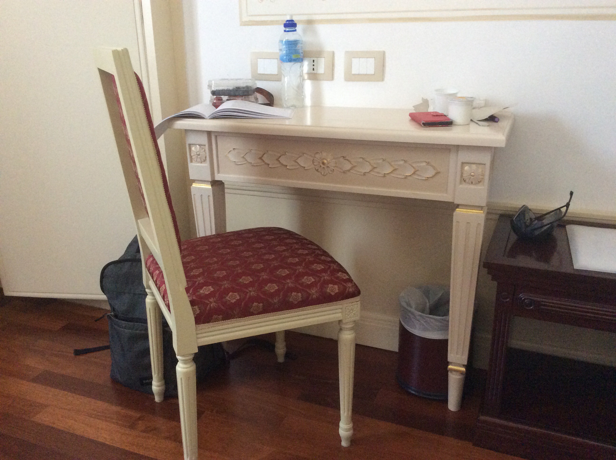 Op mijn hotelkamer heb ik een soort lage schoorsteenmantel waar de breedbeeld tv nog uitsteekt. Vanochtend heb ik het gevaarte weg laten halen waardoor ik nu een petiterig tafeltje heb. Het hotel was zo vriendelijk om een bijzetkastje te leveren en nu ben ik er helemaal klaar voor. Geen excuus meer 😉