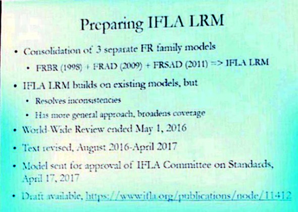 Het wachten is op goedkeuring van de IFLA Committee on Standards. De ervaren Italiaan maakte een vreugdehuppel toen hij aankondigde dat hij die snel verwacht. De eerste significante wijzigingen voortkomend uit de LRM zullen zijn opgenomen in de april 2018-versie van de RDA Toolkit.