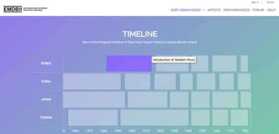 Via een tijdlijn kan men per land de muzikale ontwikkeling volgen en vergelijken.
