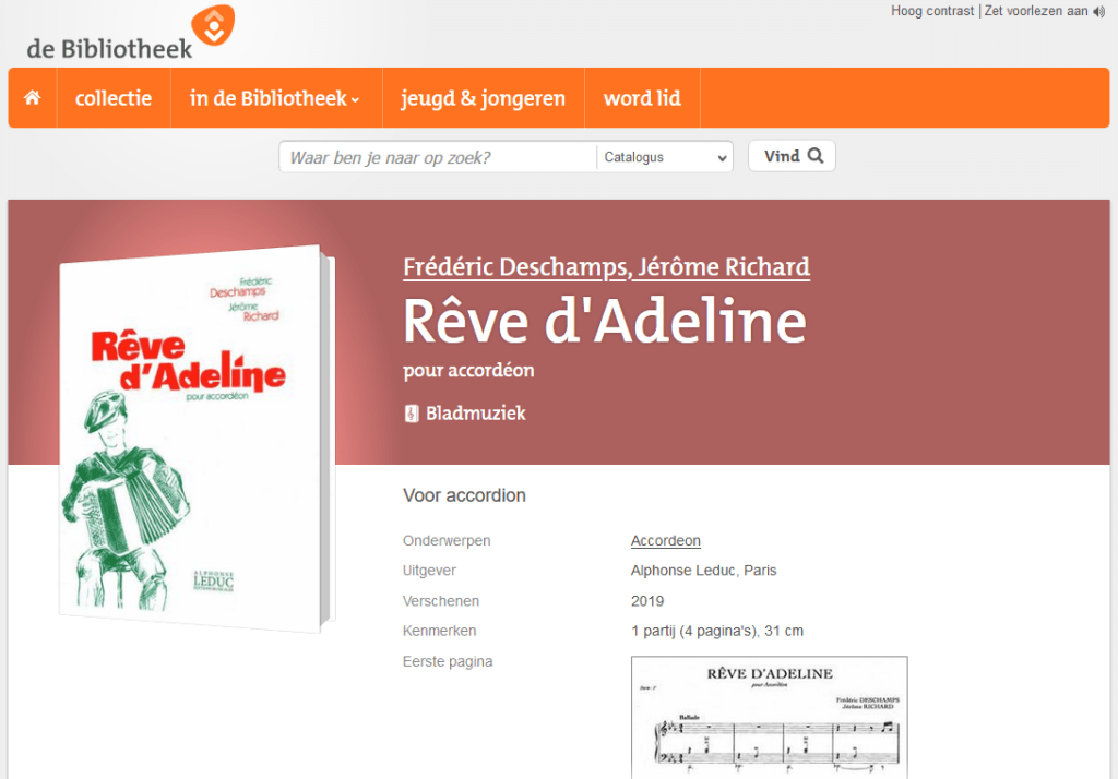 Klanten die bladmuziek zoeken via de catalogus van de bibliotheek, kunnen vanaf nu ook een afbeelding van de eerste pagina van de bladmuziekuitgave in de catalogus op Bibliotheek.nl bekijken. Zo kunnen zij, voordat ze een exemplaar aanvragen, goed inschatten of de bladmuziek aansluit bij hun niveau en smaak.