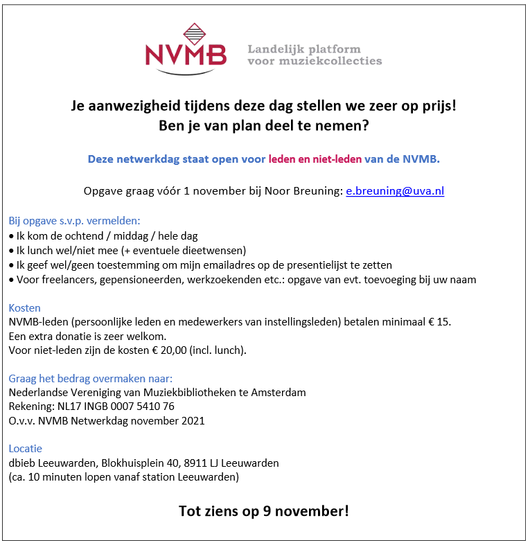 Na de digitale netwerkbijeenkomsten tijdens de coronaperiode gaan we als NVMB in november weer starten met een fysieke bijeenkomst (coronamaatregelen volente). Ronald Slager van het Frysk Muzyk Argyf zal ons op dinsdag 9 november 2021 ontvangen in dbieb in Leeuwarden.